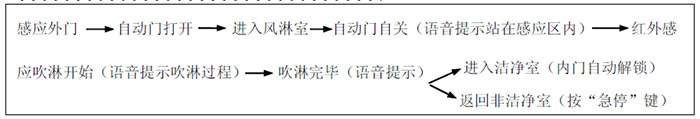 4.1 感應內門,內門自動打開,風淋室照明燈點亮,工作指示燈亮,人走進風淋室,內門自動關閉。系統開始檢測是否有人在風淋室。