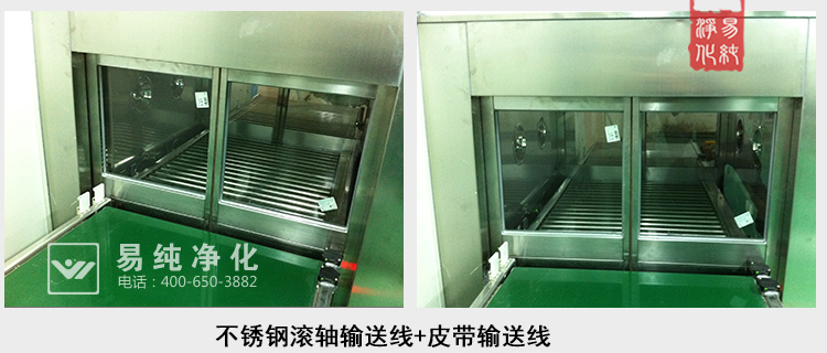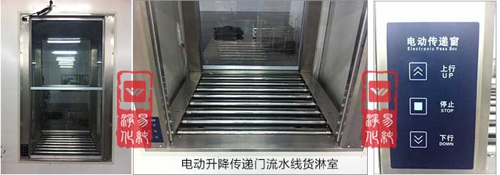 3、電動升降門貨淋室(門為電動控制上下升降),流水線被截斷成三部分,分別為潔凈區外,貨淋室內,潔凈區內;