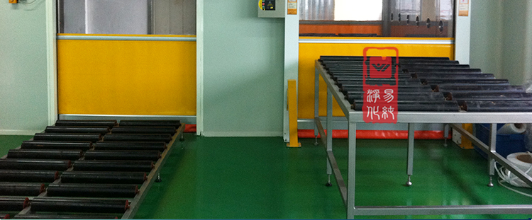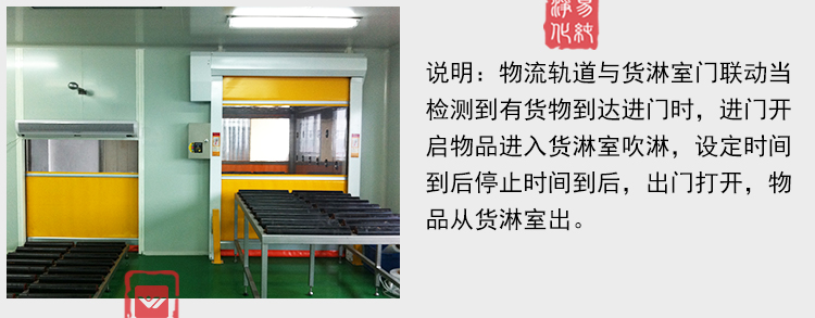 4、快速卷簾門流水線貨淋室(自動感應控制快速卷簾門),流水線可做成整體一條線,門下降時接近流水線,也可將流水線分成三部分;