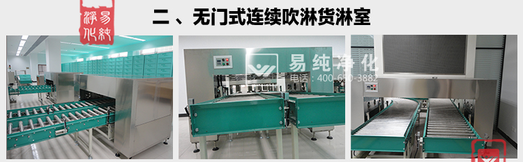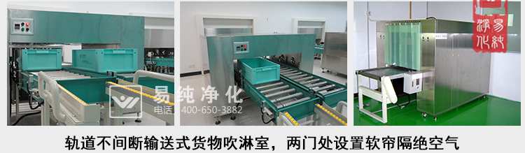 本文將重點介紹流水線貨淋室,此類貨淋室主要搭配輸送流水線配合使用。流水線是在一定的線路上連續輸進貨物搬運機械,又稱輸送線或者輸送機。按照輸送系列產品大體可分為皮帶流水線、滾筒線等流水線。一般包括牽引件承載構件、驅動裝置、改向裝置和和支撐件等,輸送機可進行水平輸送。在輸送的過程中避免了人工操作,只需要設置感應控制程序,當物體達到或進入貨淋室內時,貨淋室自動啟動吹淋,將進入潔凈室或包裝間的物體表面的灰塵吹干凈。